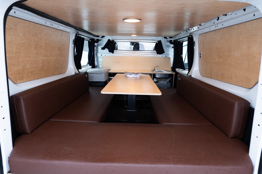 Bad weather outside? Cook, eat or work inside the camper by using the convertible table and benches. You can also use the table when the bed is build.