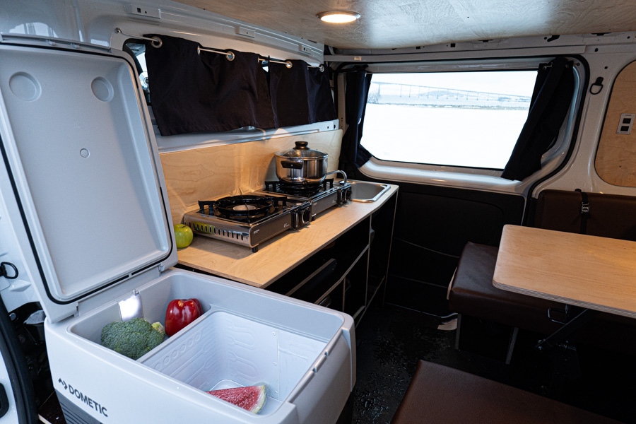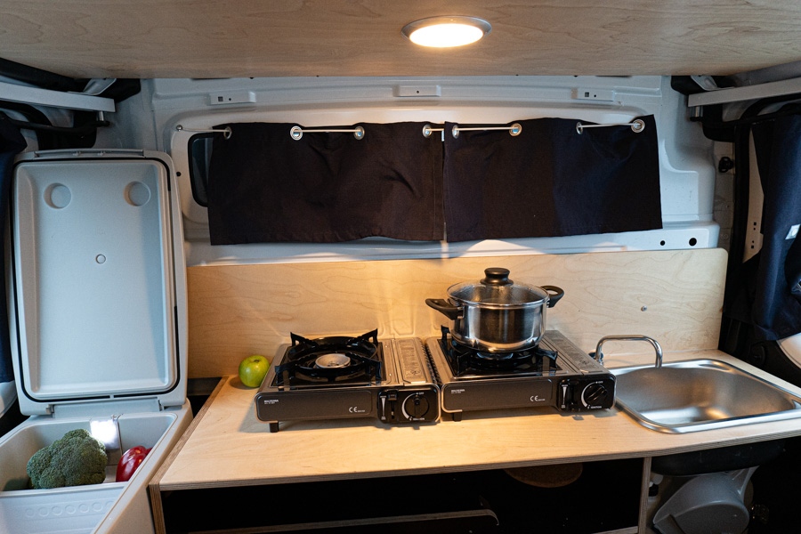 Cook with ease in the indoor kitchen, complete with a kitchen counter, two gas stoves, a real fridge (Dometic®), a sink with a galley foot water pump, and two 10L water canisters. There’s plenty of space for food storage and all the kitchen equipment you’ll need to prepare delicious meals on the go.