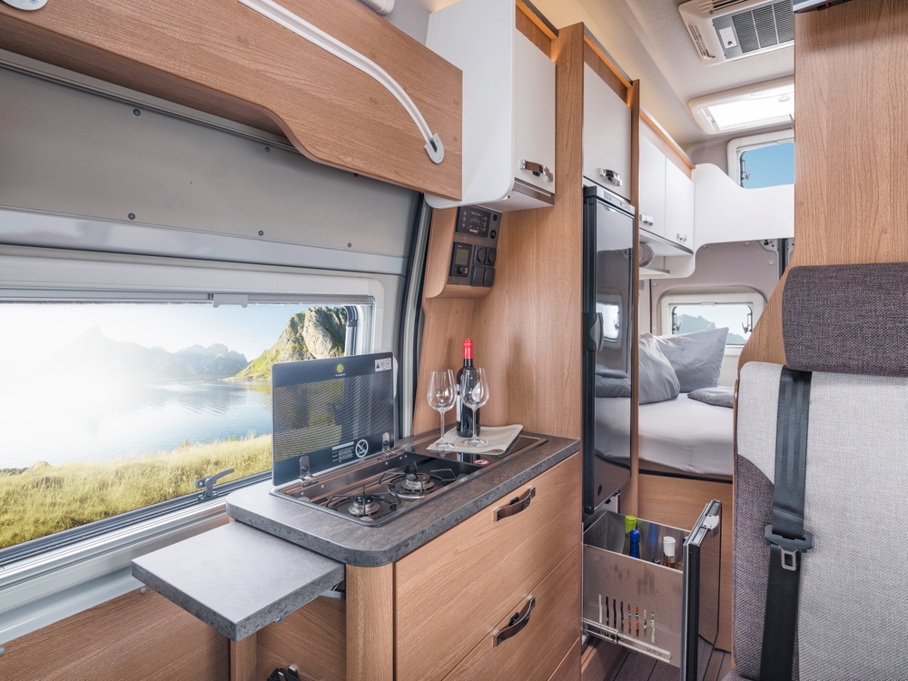 This camper category features a simple stainless steel sink without a drain. The sink can be pulled out from the kitchen block and has a capacity of 8.5 liters, making it perfect for washing dishes.