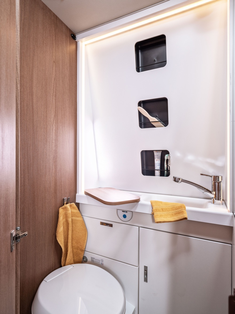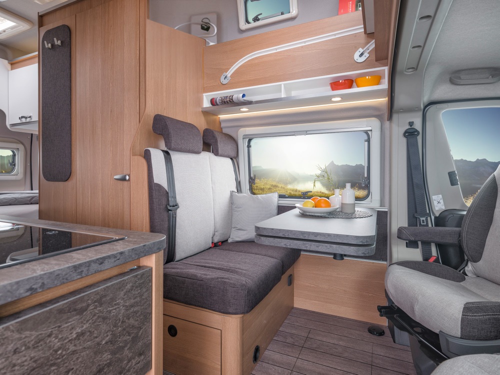 Inside, you’ll find a fixed rear bed measuring 194 × 152 cm and an EasySlide bed in the high roof measuring 200 × 130 cm. A bathroom with a toilet, shower, sink, and storage space is also integrated. The RV accommodates up to four people for both driving and sleeping, with an indoor dining area that includes a table and seating.