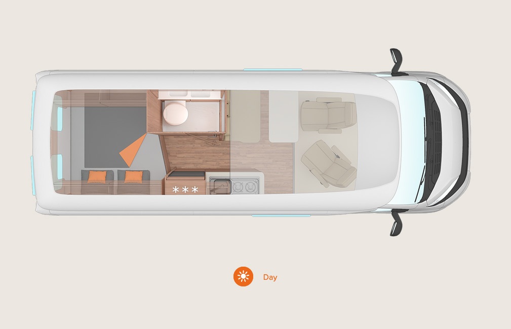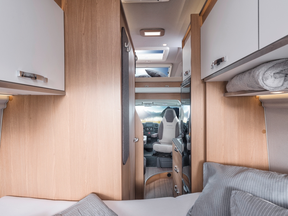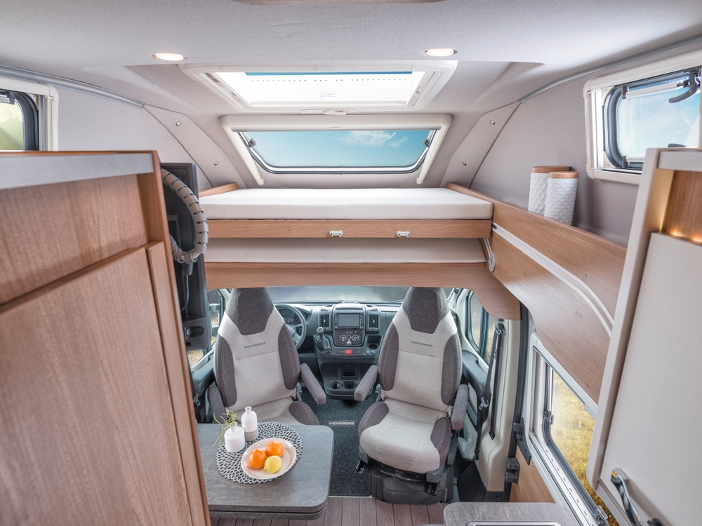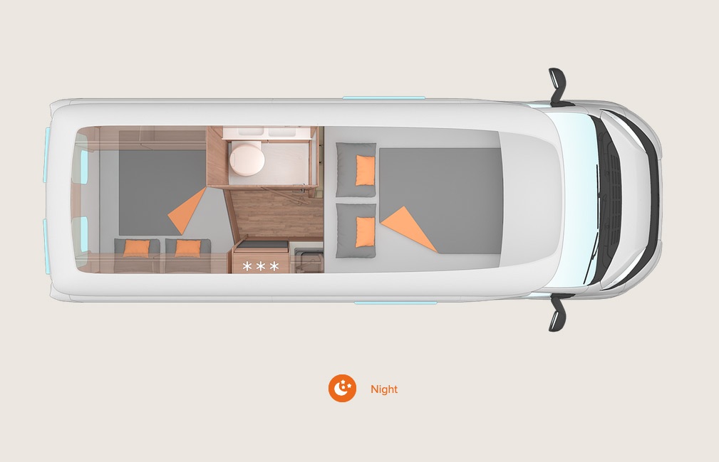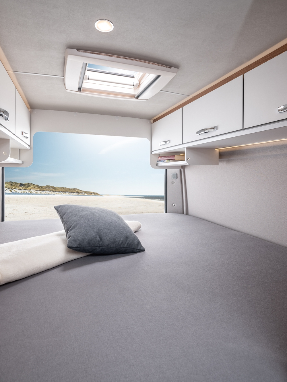 This RV category features a fixed rear bed (194 Ă— 152 cm) for two people and an EasySlide bed in the high roof (200 Ă— 130 cm), also accommodating two people. Bedding can be added as an extra when making your reservation.